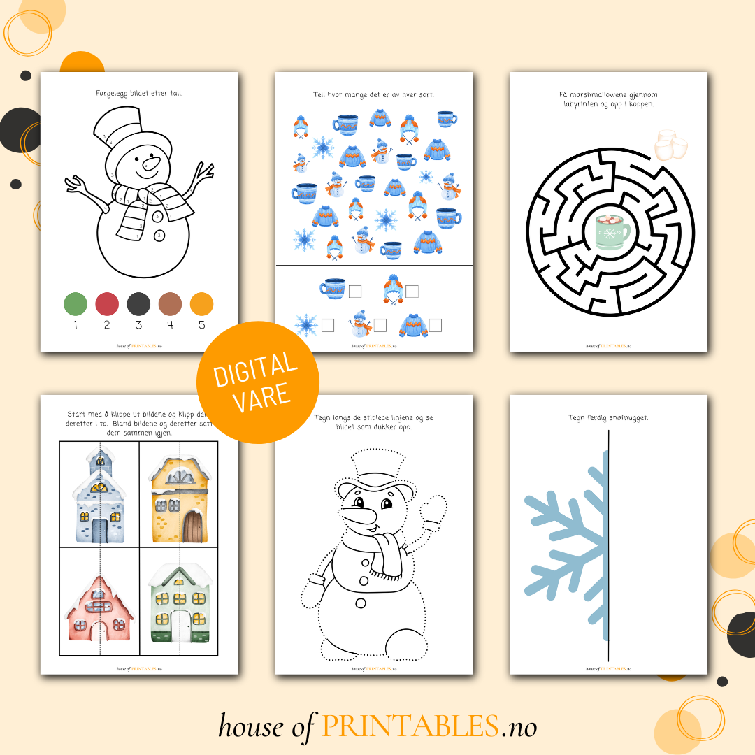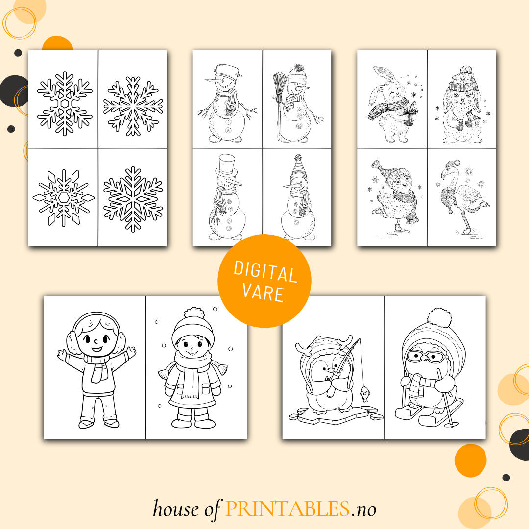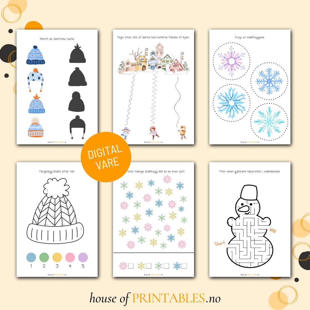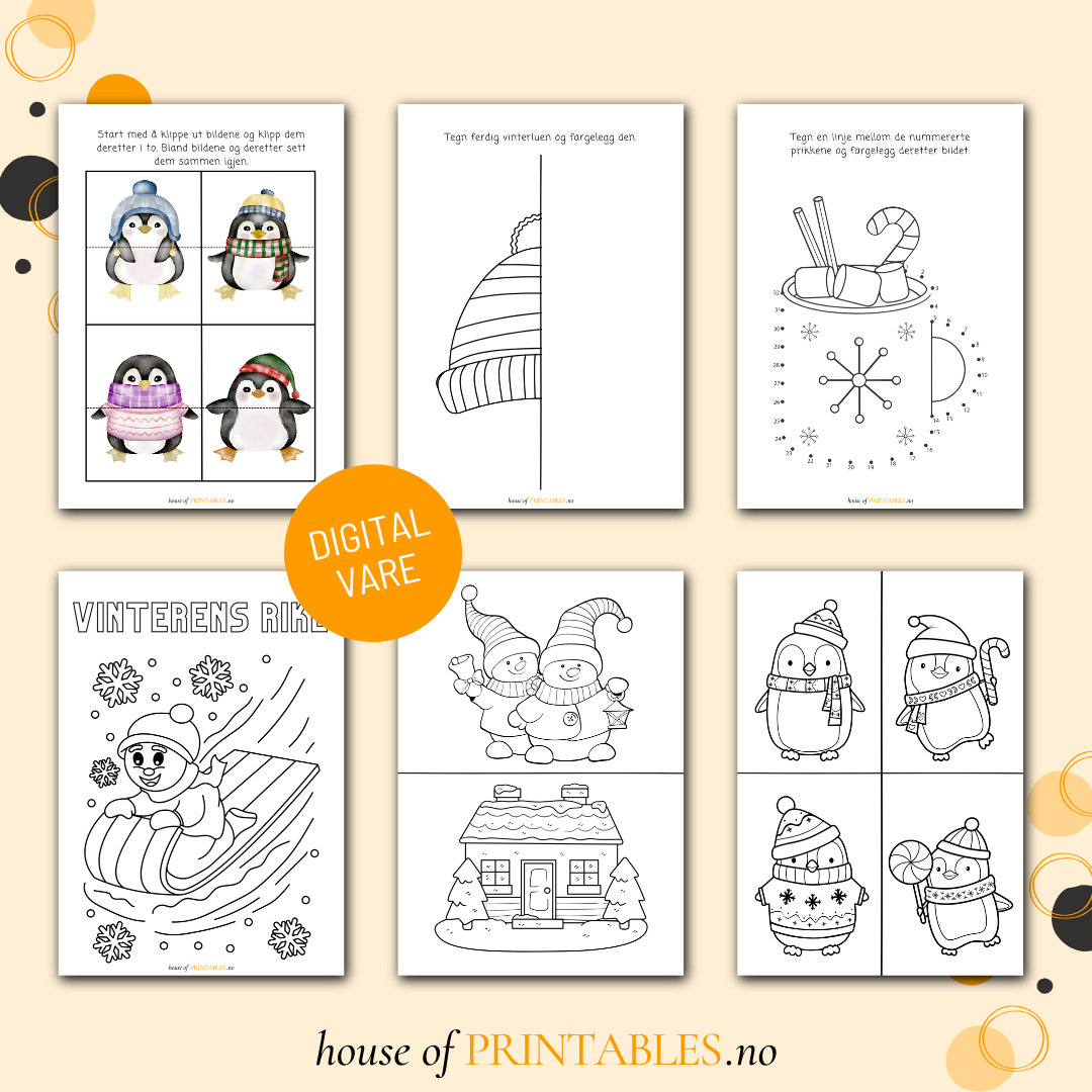 Her finner du 15 artige oppgaver og 23 morsomme vinterbilder å fargelegge.