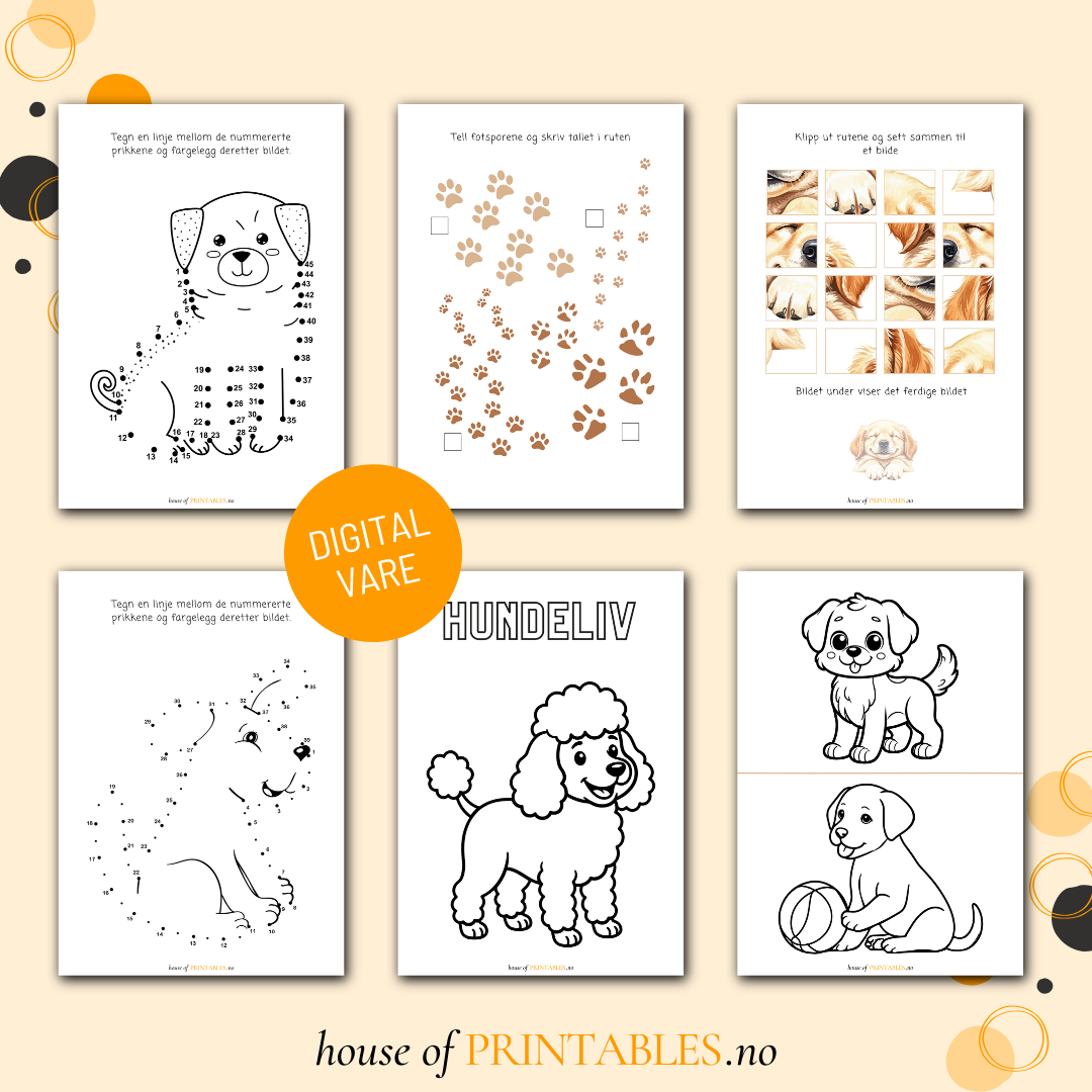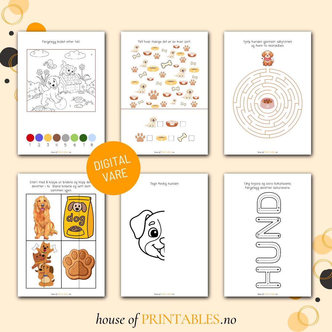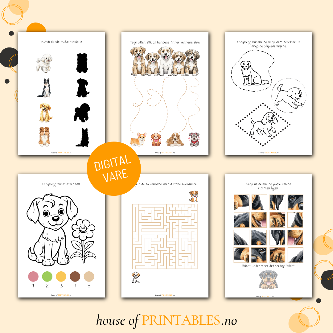 Her finner du 16 artige oppgaver og 12 morsomme hundebilder å fargelegge.