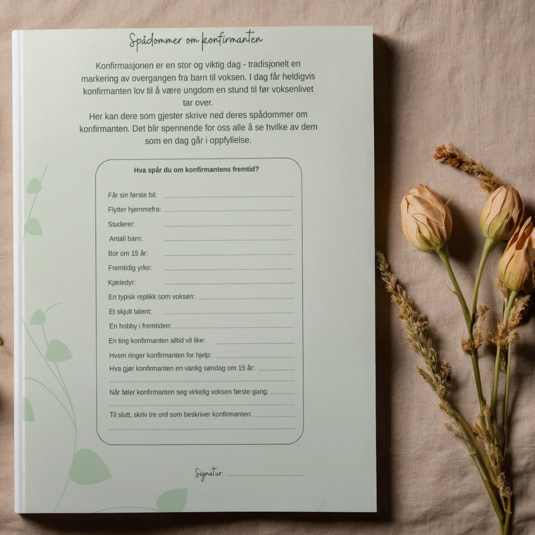 Her kan dere som gjester skrive ned deres spådommer om konfirmanten. Det blir spennende for oss alle å se hvilke av dem som en dag går i oppfyllelse.